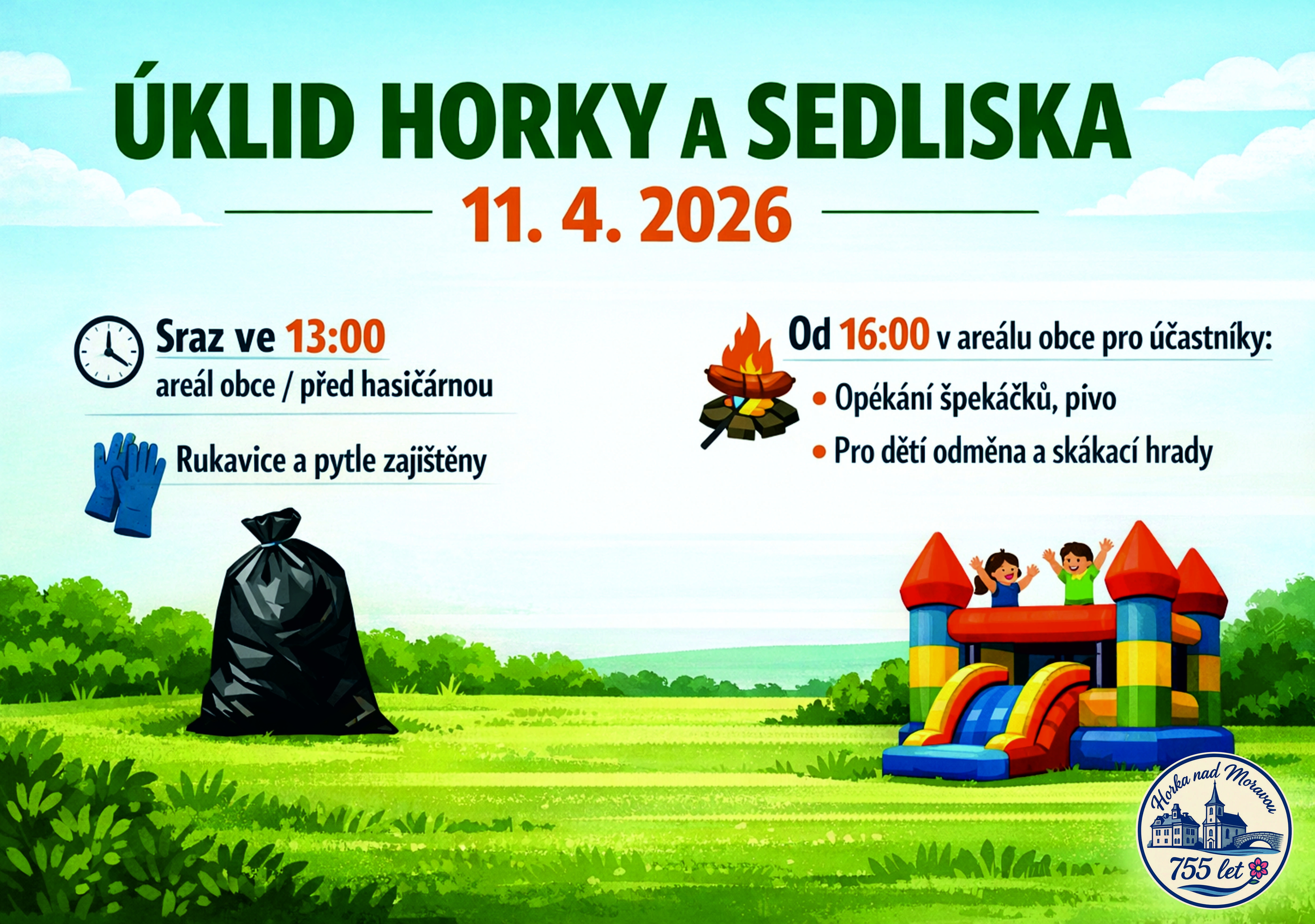 Zveme všechny dobrovolníky na společný úklid Horky a Sedliska, který se uskuteční v sobotu 11. dubna 2026. Sejdeme se ve 13:00 hodin na dvou místech - v areálu obce a před hasičárnou v Sedlisku.