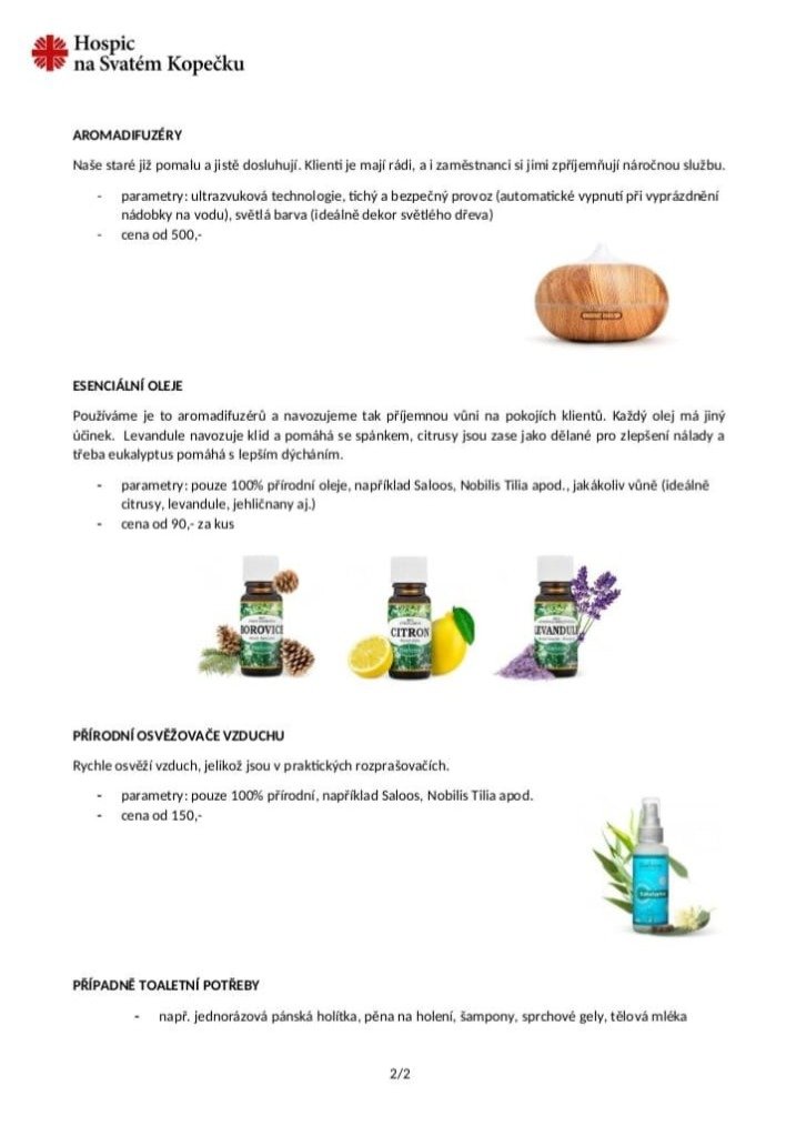 Hospic na sv. Kopečku u Olomouce je místo, kde člověk automaticky zpomalí, kde se i přes skutečnost odcházejících lidí cítí v klidu a bezpečí. Lidé zde již nepotřebují mnoho, jsou na samotném konci své životní pouti. Přesto jim poslední chvíle můžeme pár drobnostmi zpříjemnit a zjednodušit. Po konzultaci s místním personálem víme, že je potěší připínací lampičky, aromadifuzéry, osvěžovače vzduchu, toaletní potřeby, Bluetooth sluchátka či mikrosystémy na hudbu (podrobnější popis možných dárků najdete v příloze). Všechny dárky musí být nové, sterilní a nejlépe laděné do dřeva, aby se zachoval ráz jejich po domácky zařízených pokojů. Tyto dárky v hospici zůstávají pro další klienty.